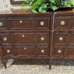 For the corner damage, we filled and rebuilt the gouged areas, then carefully color-matched and refinished to blend with the surrounding panels. The base molding required a combination of fill work for the deeper impacts and finish touch-up for the surface-level scuffing. On the back panels, we addressed the accumulated scratches and restored the protective finish layer.