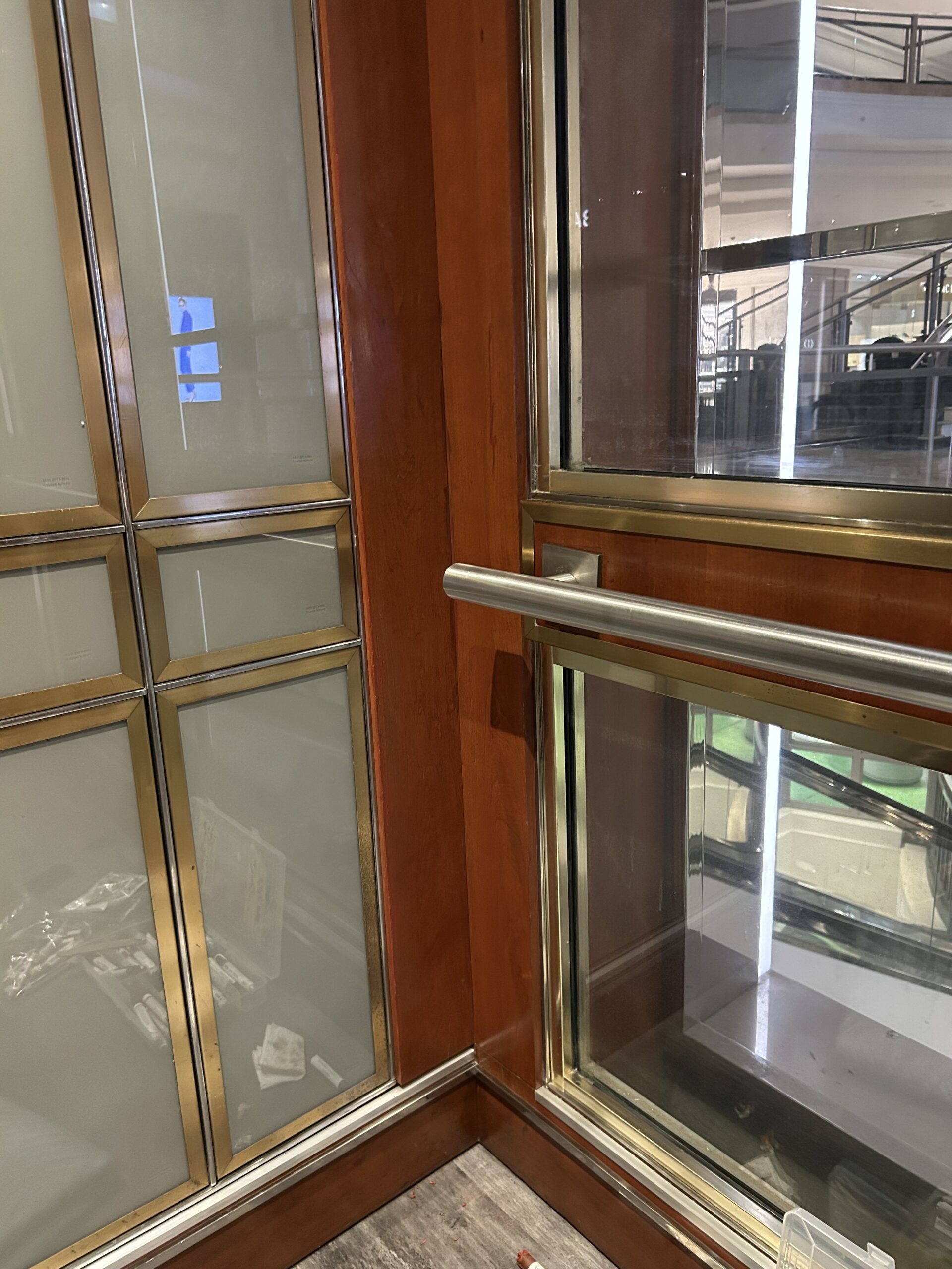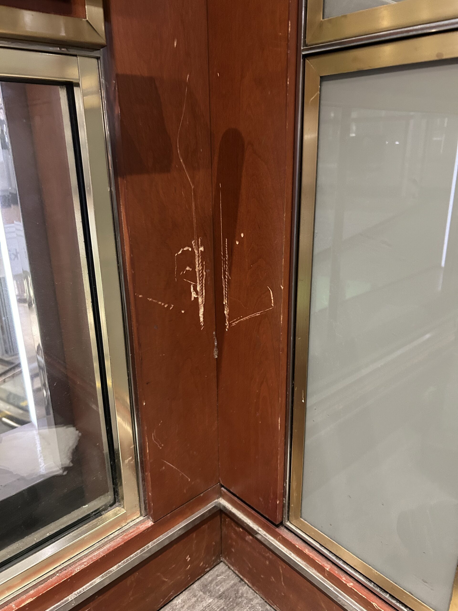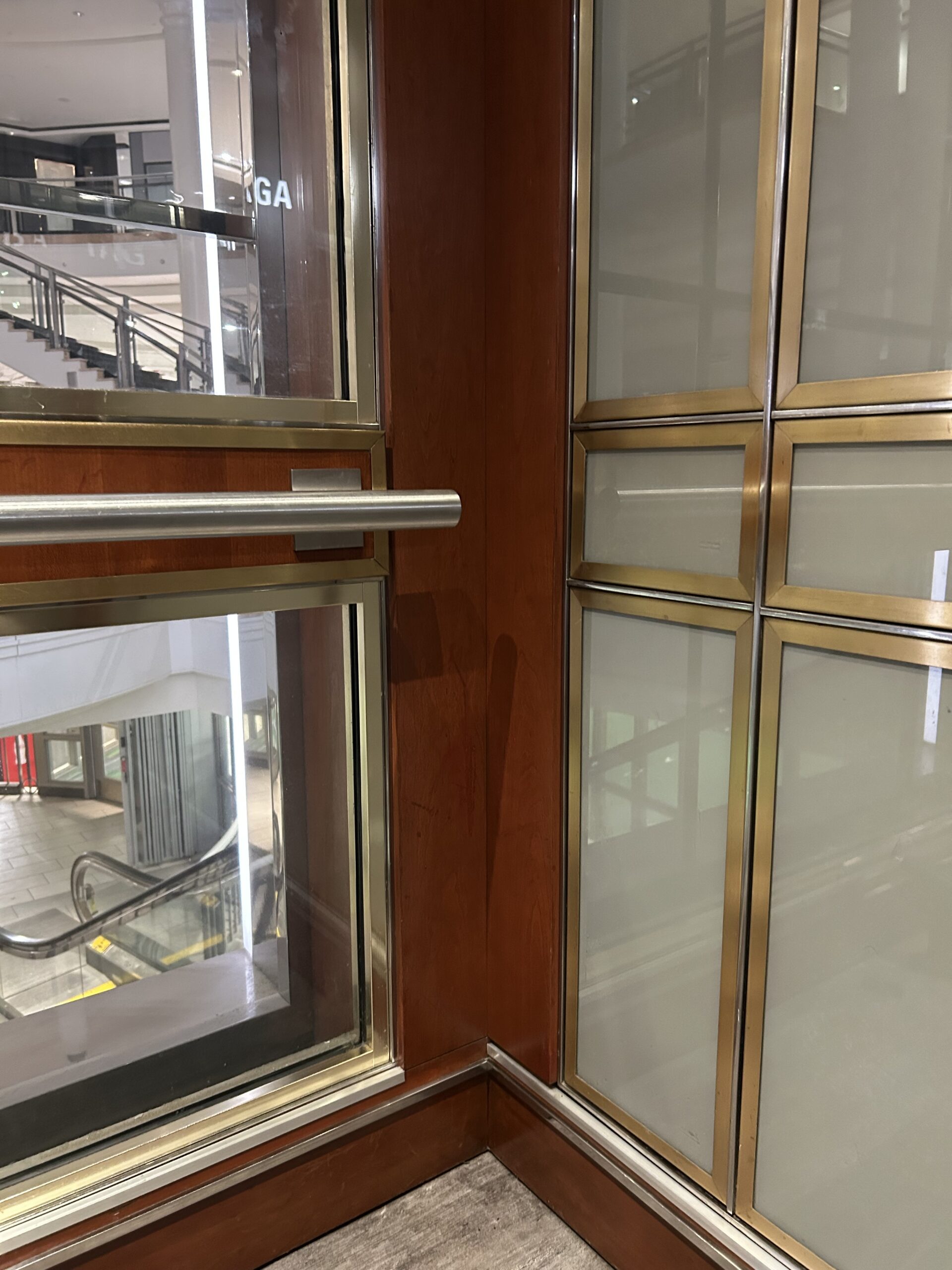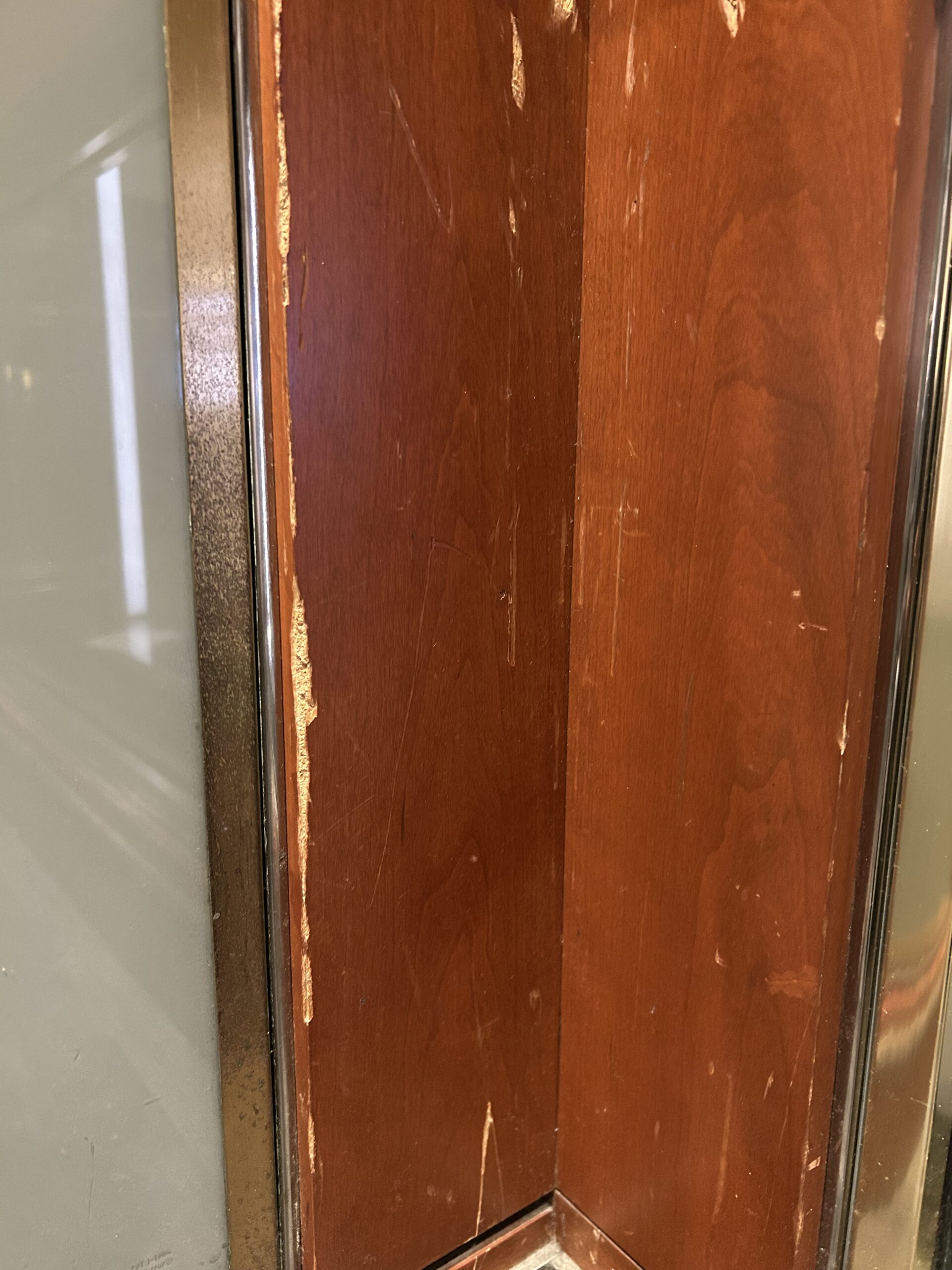 That was the situation at Phipps Plaza in Atlanta’s Buckhead neighborhood. The wood-paneled elevator cab interiors — a mix of veneer panels and solid wood trim — had accumulated the kind of damage that comes with constant, heavy foot traffic at a premier shopping destination. Corner gouges, dents along the base molding, scratches on the back panels. None of it catastrophic on its own, but together it added up to an interior that no longer matched the luxury experience Phipps Plaza is known for.