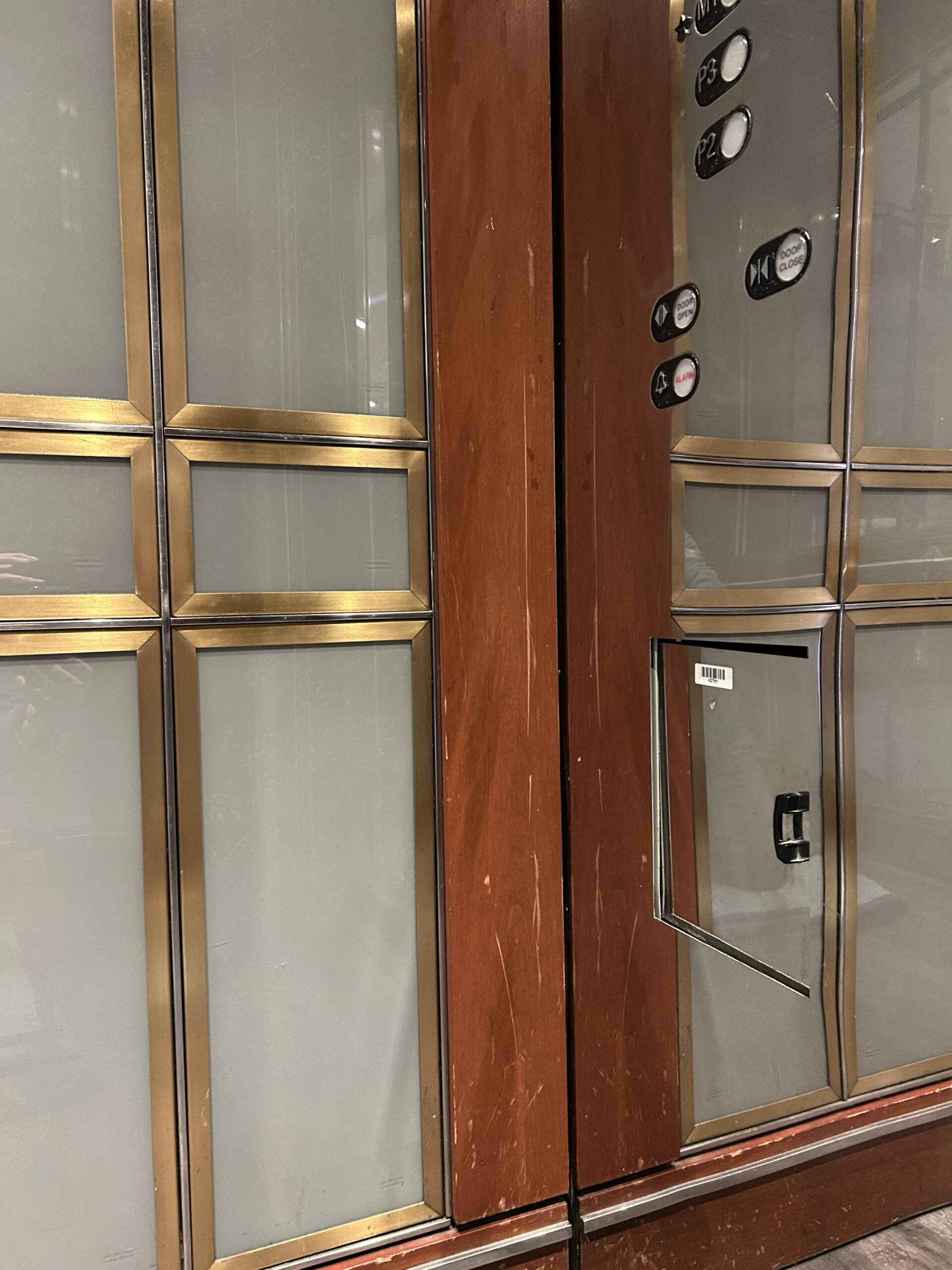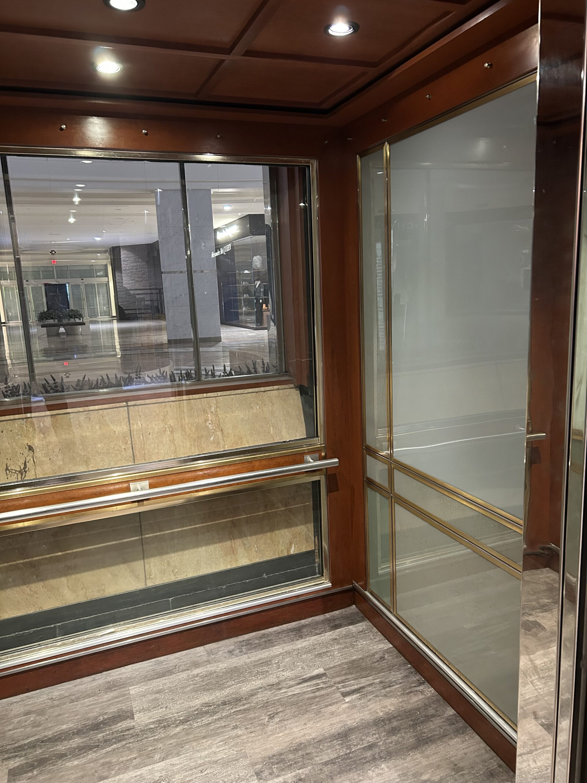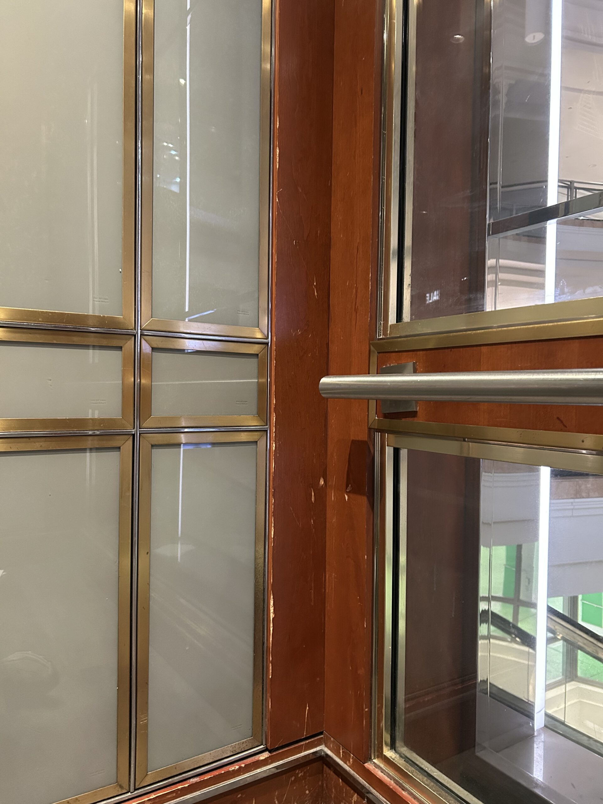 That was the situation at Phipps Plaza in Atlanta’s Buckhead neighborhood. The wood-paneled elevator cab interiors — a mix of veneer panels and solid wood trim — had accumulated the kind of damage that comes with constant, heavy foot traffic at a premier shopping destination. Corner gouges, dents along the base molding, scratches on the back panels. None of it catastrophic on its own, but together it added up to an interior that no longer matched the luxury experience Phipps Plaza is known for.