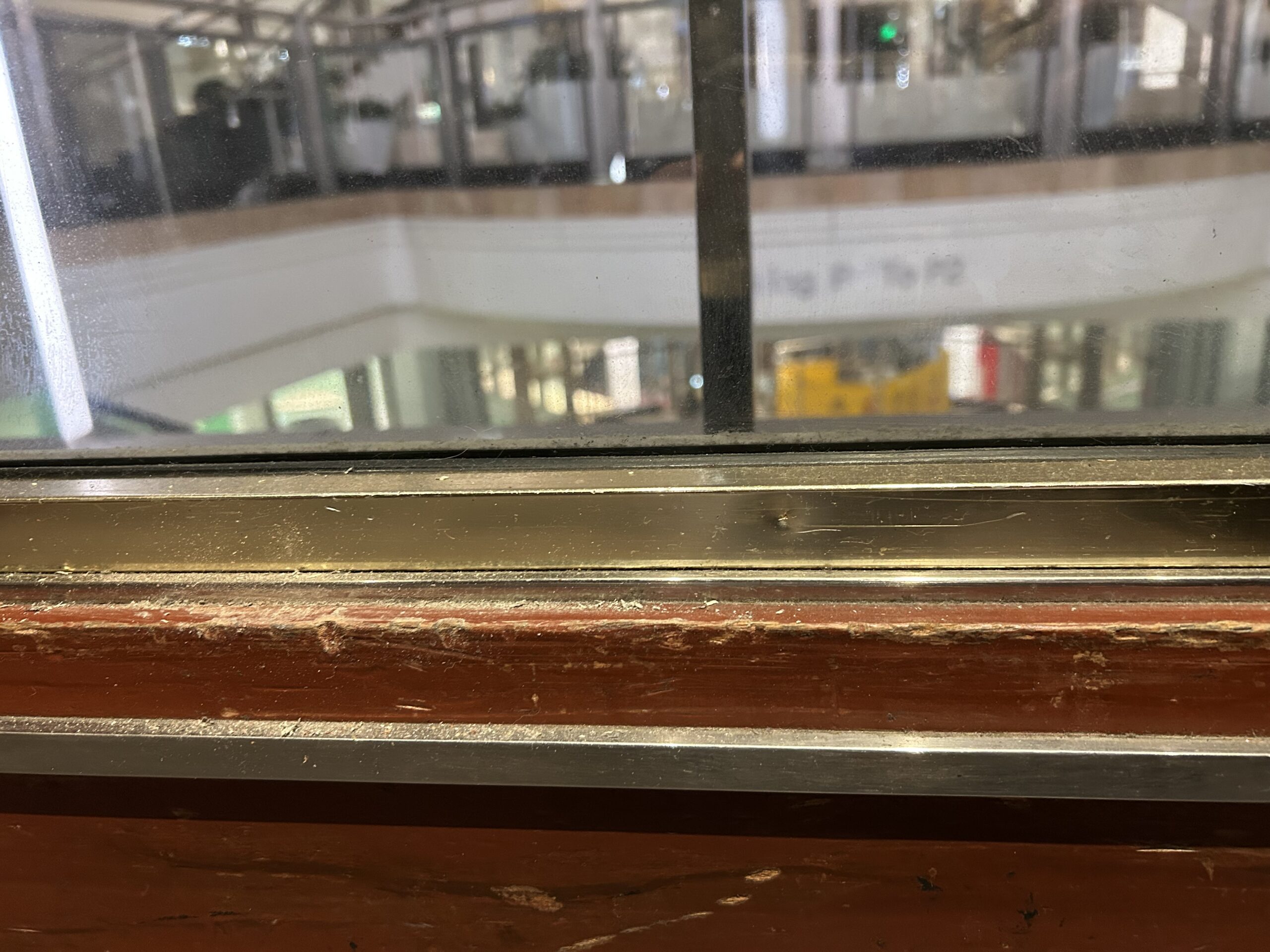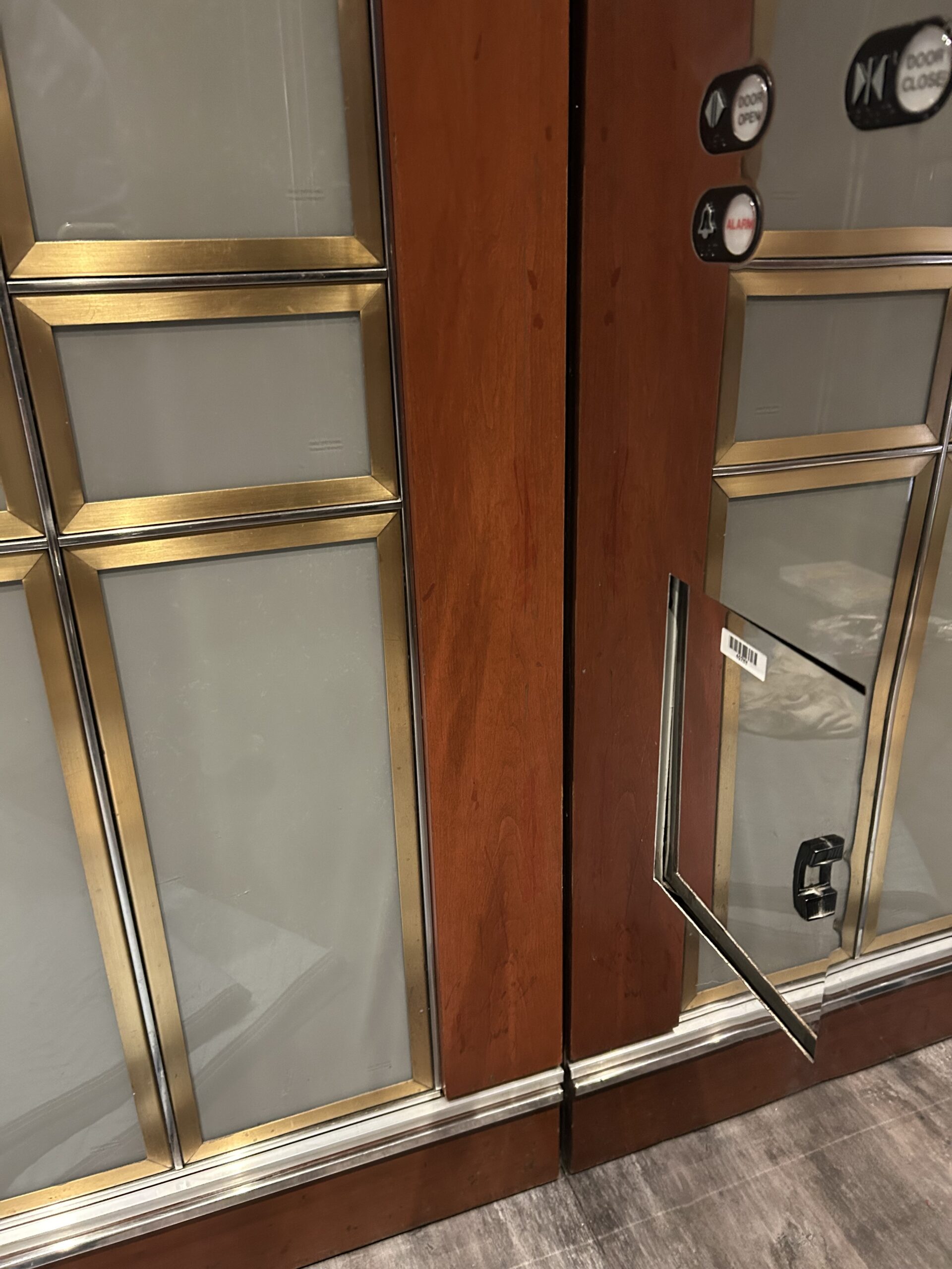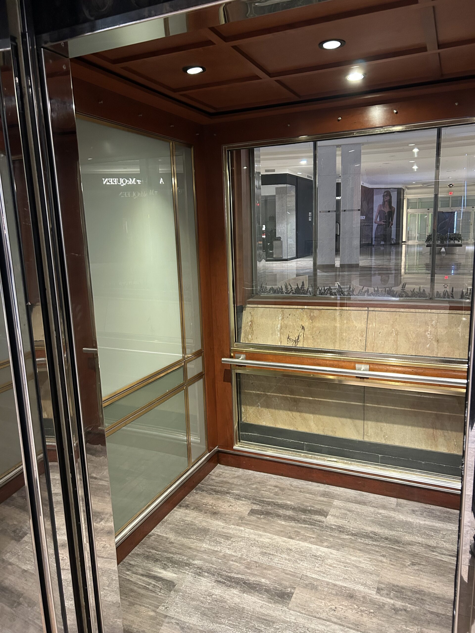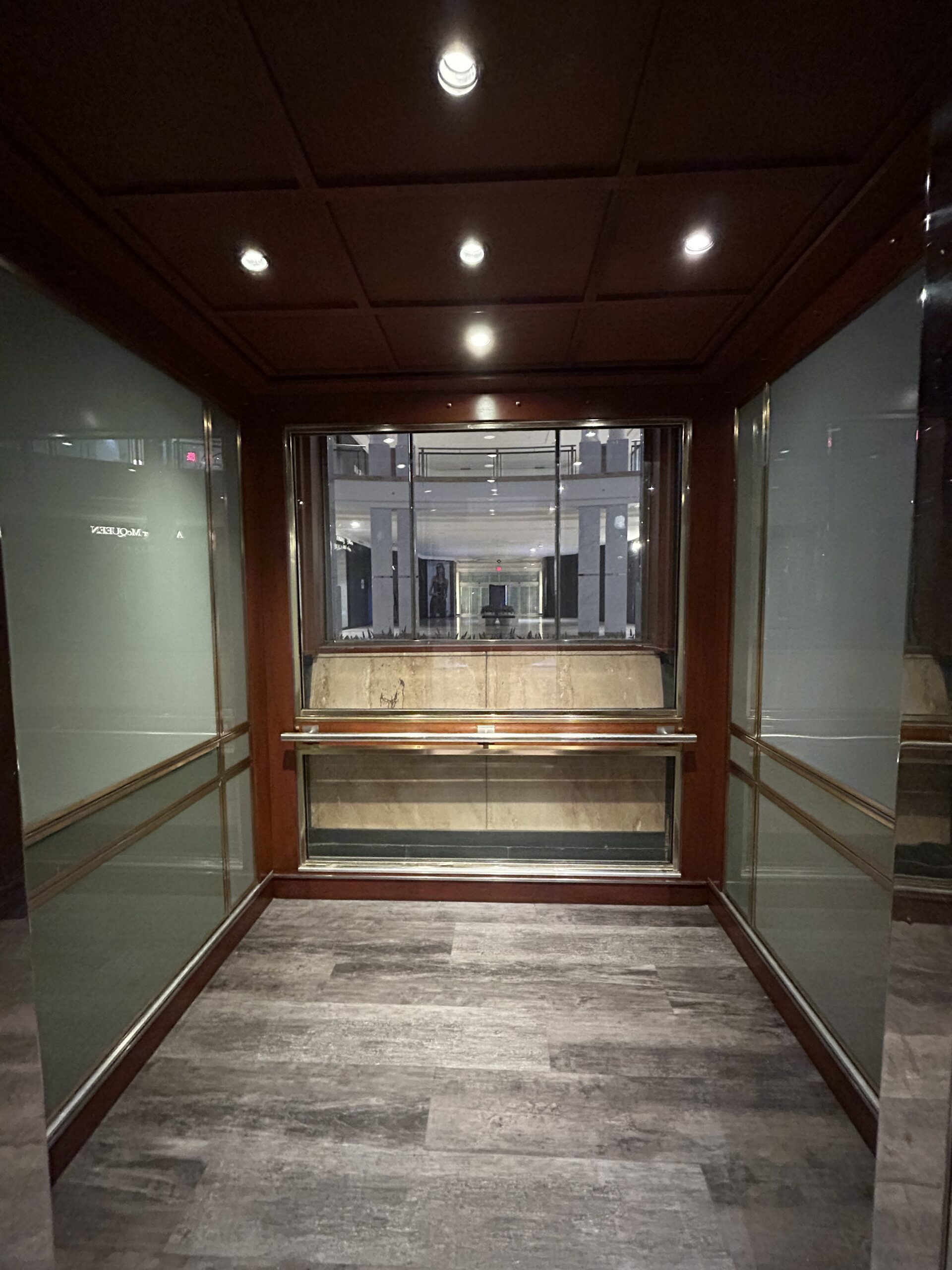 That was the situation at Phipps Plaza in Atlanta’s Buckhead neighborhood. The wood-paneled elevator cab interiors — a mix of veneer panels and solid wood trim — had accumulated the kind of damage that comes with constant, heavy foot traffic at a premier shopping destination. Corner gouges, dents along the base molding, scratches on the back panels. None of it catastrophic on its own, but together it added up to an interior that no longer matched the luxury experience Phipps Plaza is known for.